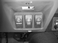 Spent a little time this morning doing the switch install and wiring. I trimmed out the switch plate that held the hard top wiper/washer switches, and opened up the third hole where I had a small temporary driving light switch. I then installed the three switches (one for compressor arming, and two for lights). Next came the wiring. I wired them so the dash lights activated the switch lower light, and I also switched the air compressor to arm with a power wire, rather than a ground wire (so I would not run the battery down). Once the wiring was done, the switches were installed and tested. They work great. They are the same OTRATTW switches I used in my Dodge M37. The left switch arms the Air Compressor, the right switch turns on my bumper mounted driving lights. The center switch, is wired to under the hood, but currently doesn't do anything, I'll need to decide what additional lights I'll install to use it for. 2013-11-08 | |