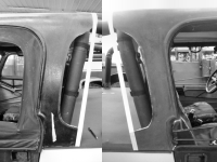Well, I decided to just cut and modify the existing upper soft door frames. So I removed the cover, and started looking at what it would take. Ended up removing rear portion of the wire frame and shortening it lengthwise by ~1", and lowering it. I also modified the lower rear corner to better match the door opening on the hard top. I also trimmed off the un-needed little wing on the lower portion of the hard top, they were there for a second bolt location, but with my Tonneau Cover, that bolt won't work. The rear line I intend to clean up will match the door opening line/angle. Now I need to get the old upper door covers re-trimmed and sewn back to fit the modified frames. I also need to determine the best method of holding the front of the hard top to the window frame. 2013-12-09 | |